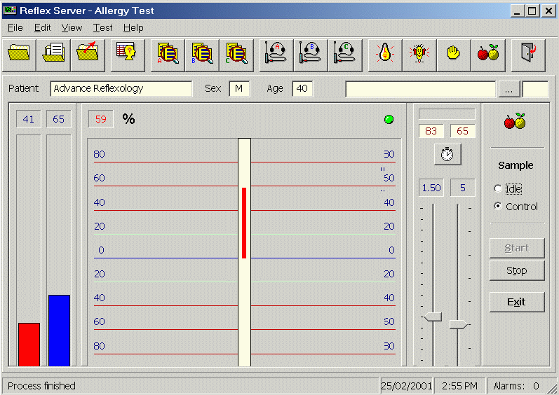 The patient must hold two electrodes (one in each hand), these electrodes will make an electrical circle around the patient’s system through which a mild electrical signal is going to be sent to different acupressure points that relate to contrasting areas of the body. There are correspondent points in the stomach, kidneys, liver, small and large intestine, etc. These are all acupuncture meridian points. When the signal comes back, the machine is able to make a measurement of the signal and will create a graphic presentation that is representing the signal. After the measuring has been completed the computer complex automatically calculates the physiological corridor of the meridians' balance in order to determine the symptoms for the patient that was examined.