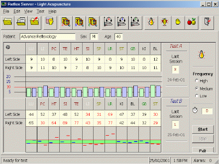 This test is designed for controlling the system of meridians by measuring electric resistance in the points of acupuncture, hands and feet. Due to the modern design of the computer complex it is possible to attain a high accuracy of measuring, which excludes possible mistakes that often happen when using similar devices. The measurements are taken in the points of acupuncture carrying information on the energetic status of a meridian from the right and from the left sides.